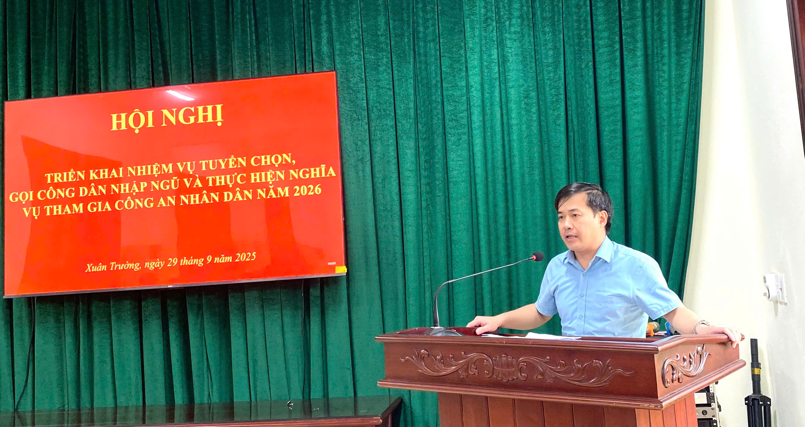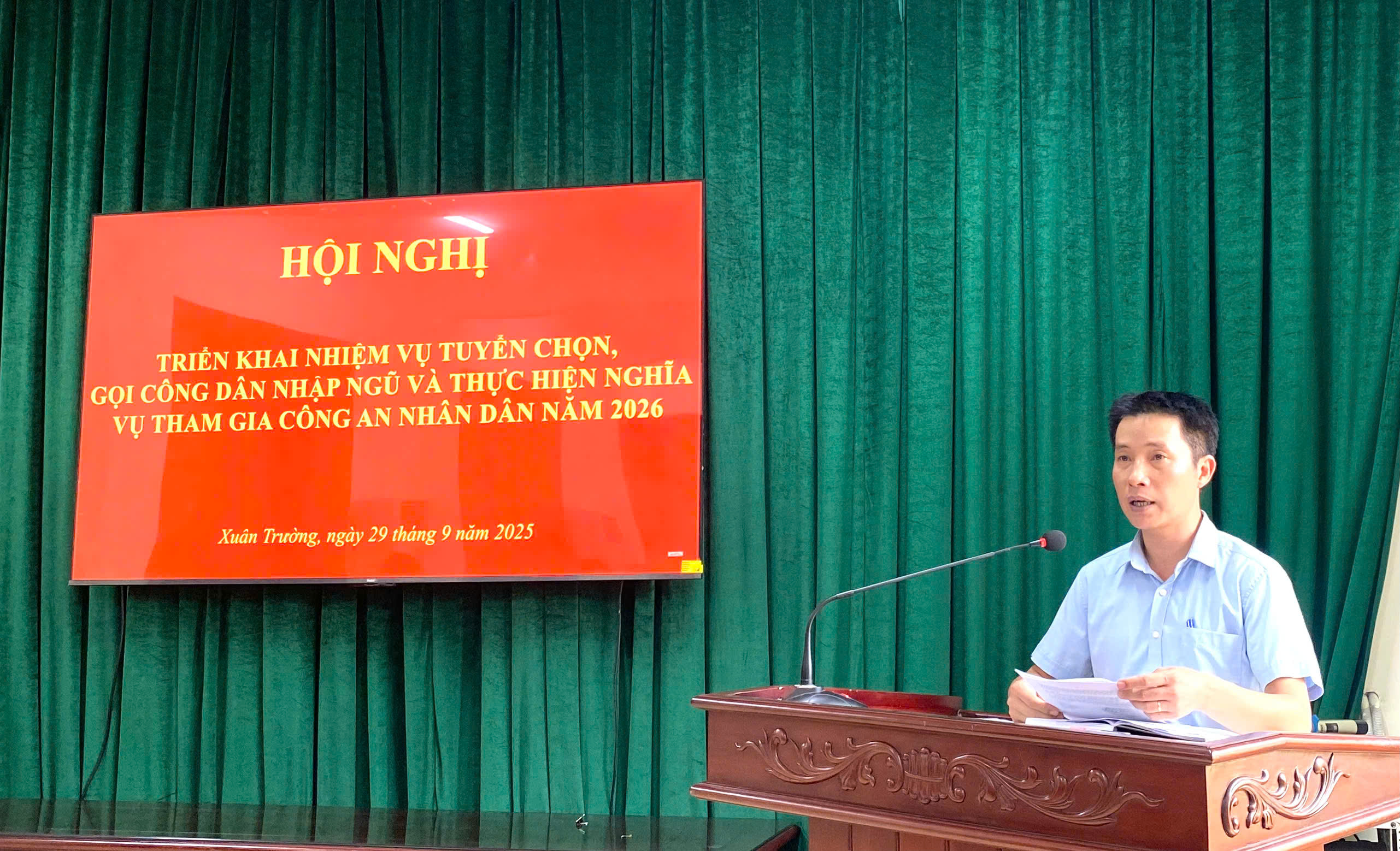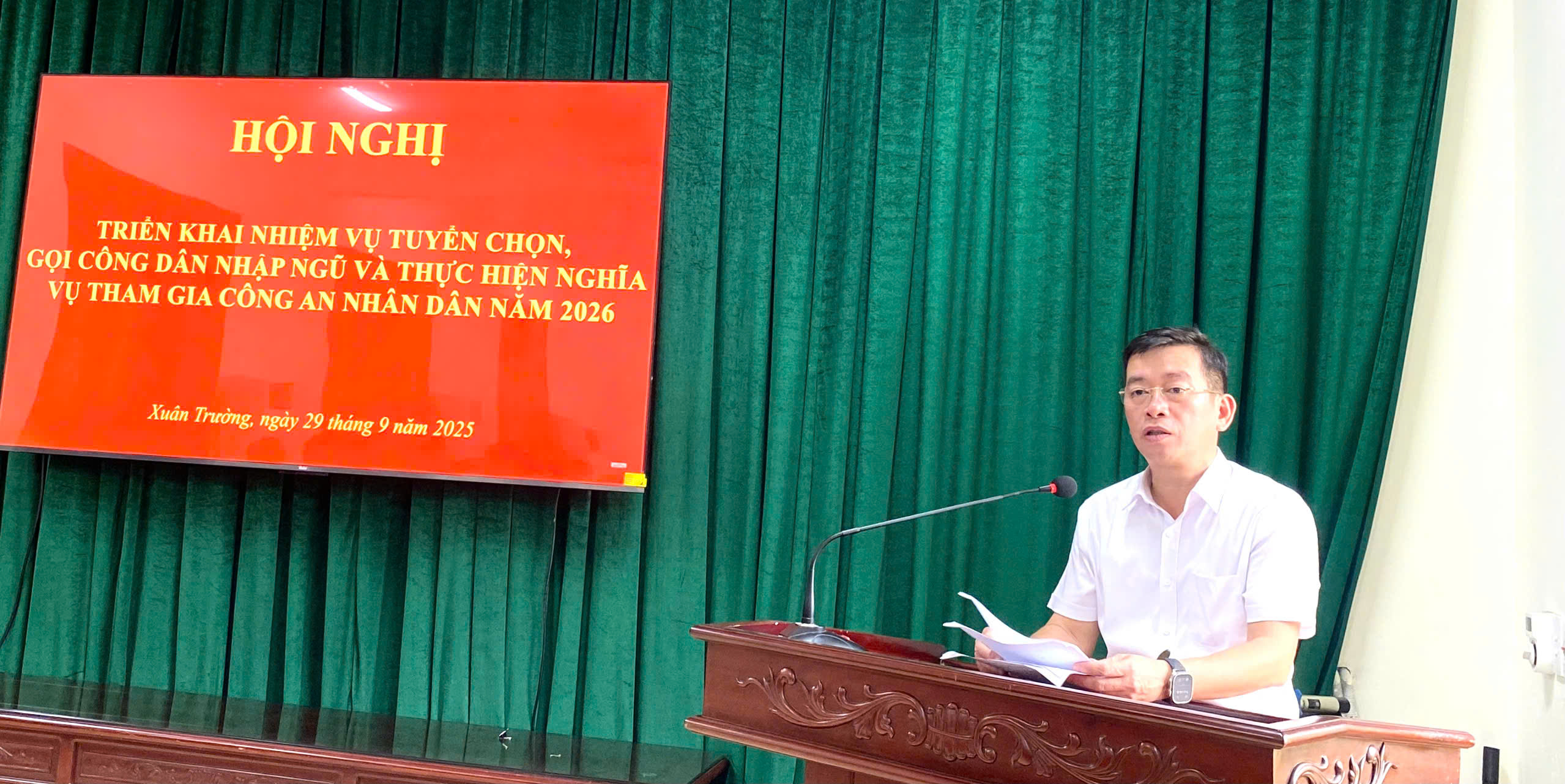 Chiều 29/9/2025, UBND xã Xuân Trường tổ chức triển khai kế hoạch tuyển chọn, gọi công dân nhập ngũ và thực hiện nghĩa vụ tham gia Công an Nhân dân năm 2026. Dự hội nghị có Trung tá Trần Thanh Hà- Tham mưu phó BCH phòng thủ khu vực 3- Đông A, đồng chí Trịnh Văn Hoàng- Bí thư Đảng ủy, Chủ tịch HĐND xã, đồng chí Phạm Duy Chinh- Phó Bí thư Thường trực Đảng ủy, đồng chí Phạm Ngọc Hải- Phó Bí thư đảng uỷ, Chủ tịch UBND xã, Chủ tịch Hội đồng NVQS xã; Các đồng chí Uỷ viên Ban Thường vụ Đảng uỷ, Phó chủ tịch HĐND- UBND xã, thành viên Hội đồng nghĩa vụ quân sự xã, Lãnh đạo một số cơ quan ban ngành đoàn thể, cacs đồng chí trưởng thôn trên địa bàn xã.