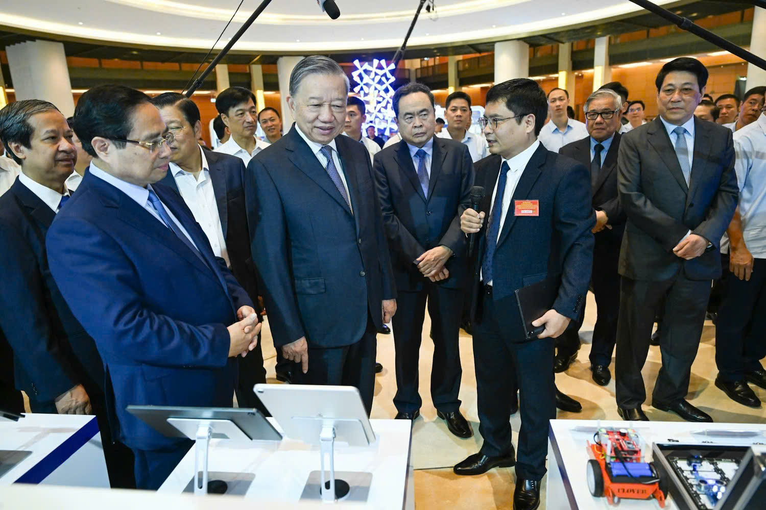 Tổng Bí thư Tô Lâm cùng các đồng chí lãnh đạo Đảng, Nhà nước tham quan triển lãm những thành tựu nổi bật trong ngành y tế và giáo dục tại điểm cầu Trung ương.